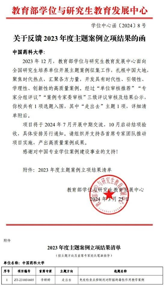 近日,教育部学位与研究生教育发展中心2023年主题案例征集评审结果揭晓,公司yl6809永利检测中心李婷婷副教授申报的案例《免疫检查点抑制剂对肝脏的毒性作用教学案例》获得立项。