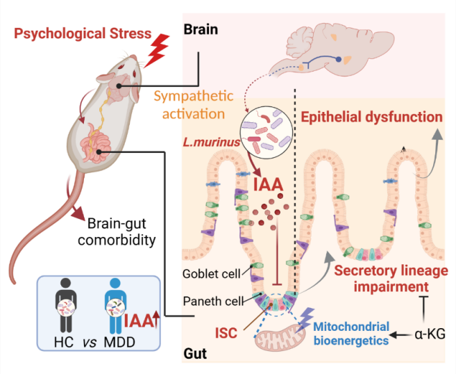 流行病学研究表明,长期暴露于精神心理压力会驱动多种疾病的发生发展。然而,目前人们对于精神应激下脑-肠双向信号传递机制,特别是心理压力如何传递并扰动肠道内稳态仍然知之甚少。围绕以上问题,郝海平教授团队基于前期建立的慢性束缚应激小鼠模型及足底电击模型,发现慢性心理压力暴露会引发不可逆的小肠上皮细胞功能紊乱。该研究发现慢性精神应激触发的交感神经输出诱导肠道共生乳杆菌及色氨酸代谢物吲哚-3-乙酸(IAA)的富集,IAA作为代谢信号抑制小肠干细胞(ISC)的线粒体生物能从而以细胞固有的方式破坏其谱系分化、加重肠上皮细胞损伤。最后,研究团队在患有不同精神困扰的临床患者中证实精神应激下肠道菌群IAA产生能力持续增加并与肠道功能障碍相关。该研究通过多学科技术手段,揭示了精神应激下微生物失调驱动肠干细胞分化异常的信号分子及其机制,为后续开展脑肠轴信号传递、靶标发现及药物精准干预研究提供了新思路与潜在新靶点。