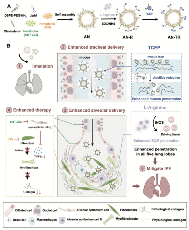 特发性肺纤维化(IPF)是一种与年龄相关的肺间质疾病,病因不明,对人类健康构成严重威胁。临床上IPF主要通过口服尼达尼布(NIN)实现,但其在肺部的蓄积量过低且忽视对上皮细胞的作用。吸入疗法是治疗肺部疾病的有效途径。然而,气管中的黏液屏障和间质中的细胞外基质(ECM)屏障是吸入治疗递送的两个主要障碍。姜虎林团队利用三-(2-羧乙基)-膦(TCEP)和L-精氨酸分别穿透黏液和ECM屏障,构建了双重屏障穿透吸入脂质体(AN-TR)。这种方法有助于NIN和navitoclax(ABT-263)在五个肺叶中的均匀分布。此外,ABT-263可以去除气管和肺泡中衰老的上皮细胞,从而提高NIN治疗IPF的效果。这项研究表明,双重屏障穿透吸入脂质体是一线临床药物的有效无创载体,可提高IPF治疗的效果。