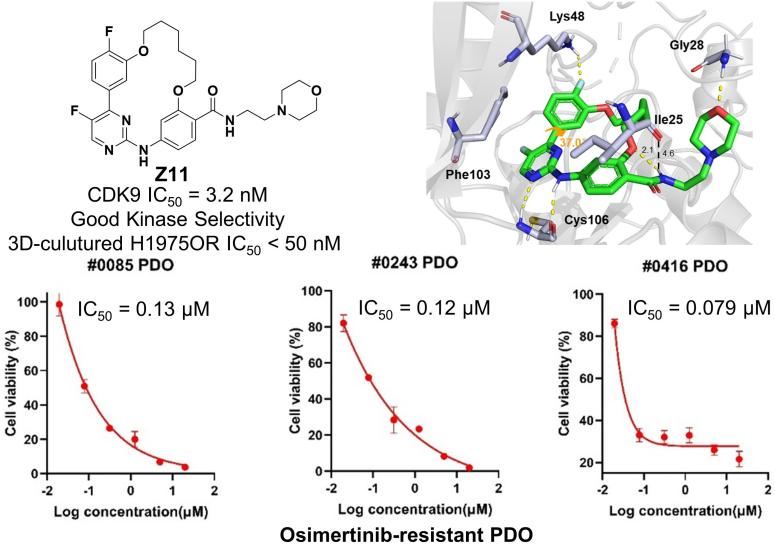 CDK9对抗凋亡蛋白Mcl-1的直接调控作用使其成为抗肿瘤药物开发的有效靶点。该研究团队依托蛋白结构分析,运用大环化策略设计出一系列大环类CDK9抑制剂。其中,优势化合物Z11不仅显著抑制CDK9蛋白活性(IC50 = 3.2 nM),而且具有高度的激酶选择性,在多种肺癌细胞中展现出明显的抗肿瘤作用。值得一提的是,Z11对两种奥西替尼耐药肺癌细胞株也表现出显著的抗肿瘤效应(HCC827OR: IC50 = 0.25 μM; H1975OR: IC50 = 0.15 μM),其活性远超阳性对照药物BAY1143572。进一步研究显示,在奥西替尼耐药细胞株H1975OR中,Z11能快速下调Mcl-1蛋白水平,抑制细胞增殖和克隆形成,并诱导细胞凋亡。药效评估表明,低剂量的Z11能有效抑制多个奥西替尼耐药肺癌类器官的生长,并且具有适中的代谢性质和良好的体内安全性。