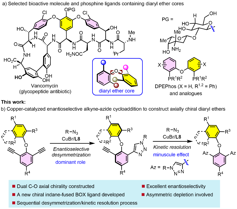 二芳基醚类骨架广泛存在于各类天然产物、药物及生物活性分子中,具有广谱的生物活性。目前,围绕二芳基醚类化合物的不对称合成方法仍然十分有限,主要包括:动态动力学转化、酶或有机小分子催化二芳基醚骨架的去对称化等策略。然而,利用过渡金属催化去对称化策略构建此类骨架迄今仍未有报道。近年来,姚和权团队针对具有重要生物活性的药物分子片段和砌块,采用过渡金属催化去对称化策略,合成了多类手性分子骨架。在此基础上,该团队通过铜催化的不对称叠氮-炔环加成反应,首次实现了过渡金属催化的轴手性二芳基醚类化合物的不对称合成。该研究为轴手性二芳基醚类化合物在药物研发、C-O轴手性配体的设计合成等领域的研究奠定了合成基础。