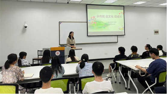 钟文英书记简要介绍了开展“培苗树人”工作的背景、要求以及支部基本情况,并以《承传统 品文化 话成长》为主题为同学们讲授党课。她从屈原诗词、“真理的味道有点甜”的党史故事、两会热词“新质生产力”等方面切入,勉励同学们厚植爱国情怀,做好职业规划,为生物医药产业高质量发展贡献力量。