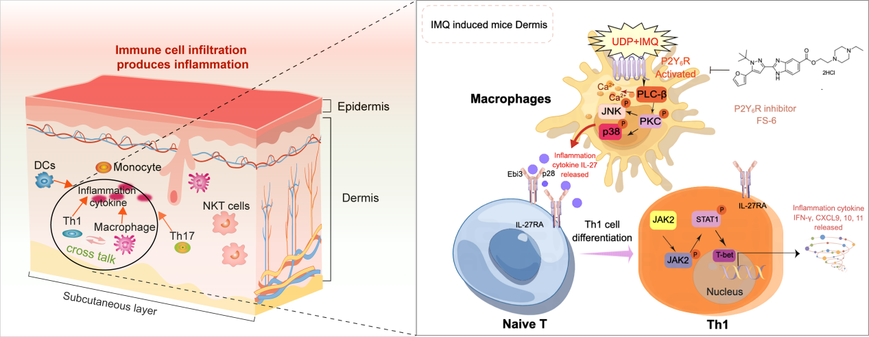 近日,医学学科顶尖期刊Acta Pharmaceutica Sinica B在线发表了公司yl6809永利检测中心胡庆华/周梦泽团队的最新研究成果“Macrophage P2Y6R activation aggravates psoriatic inflammation through IL-27-mediated Th1 responses”。yl6809永利检测中心博士尹力为本论文的第一作者,yl6809永利检测中心胡庆华教授、周梦泽助理研究员和苏州大学李环球副教授为共同通讯作者,yl6809永利检测中心为第一通讯单位。
