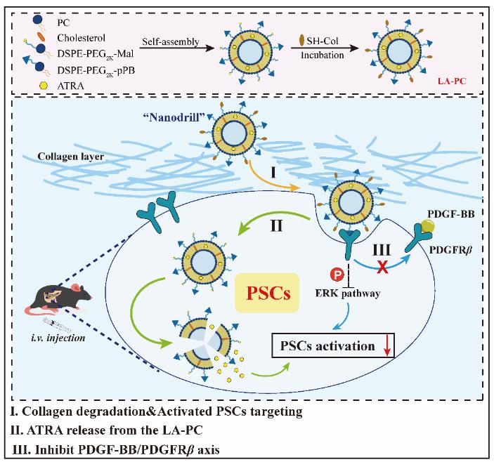 PSC的活化在CP的始动和演进过程中均发挥了重要作用,其分泌的致密ECM严重阻碍了治疗药物向靶部位胰腺的深层递送,大大削弱了药物的抗胰腺纤维化治疗效果。针对这一问题,该研究团队通过在脂质体表面负载胶原酶I和PSC靶向肽(pPB肽)设计了一种全新的PSC靶向调控平台(命名为LA-PC),胶原酶I能够有效分解CP胰腺中致密的ECM层,实现LA-PC的胰腺组织深层分布。此外,LA-PC表面修饰的pPB肽与激活的PSC表面血小板衍生生长因子受体β(PDGFRβ)相结合,增加PSC对药物的有效摄取。这一有效结合还能够抑制血小板衍生生长因子B(PDGF-BB)对PDGFRβ的激活,进而抑制其下游MAPK通路,抑制PSC的活化,有效治疗胰腺纤维化。该研究成果以“A PDGFRβ-targeting nanodrill system for pancreatic fibrosis therapy”为题发表在Chinese Chemical Letters上,论文第一作者为yl6809永利检测中心yl6809永利检测中心韩涵博士后和陈比特硕士生,yl6809永利检测中心姜虎林教授和邢磊副教授为本文共同通讯作者。