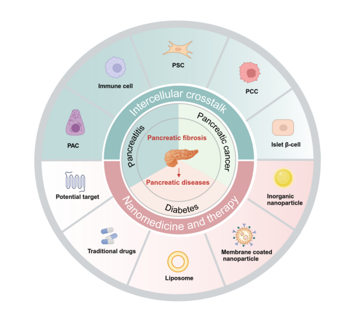不同疾病背景下,纤维化病理微环境中与PSC相互作用的细胞机制不同。基于前期的工作基础,本团队系统总结纤维化在三种常见胰腺内外分泌疾病(包括胰腺炎、胰腺癌和糖尿病)进展中的作用,并分析了不同疾病的纤维化微环境中错综复杂的细胞间互作机制,探讨了纳米药物在纤维化及胰腺疾病中的潜在靶点及治疗策略,为深入了解胰腺疾病中PSC介导的细胞间互作机制及基于纳米药物的精准治疗提供有价值的见解,以“Nanomedicine regulating PSC-mediated intercellular crosstalk: mechanisms and therapeutic strategies”为题发表在Acta Pharmaceutica Sinica B上,论文共同第一作者为东南大学医学院王慧博士生、祁靓博士和yl6809永利检测中心yl6809永利检测中心韩涵博士后,东南大学附属中大医院李玲教授和yl6809永利检测中心yl6809永利检测中心姜虎林教授为本文共同通讯作者。