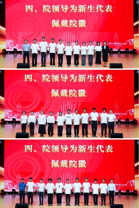 与会院领导为新生代表们佩戴院徽,在线参会的家长代表通过留言表达了对学校和员工的祝福。