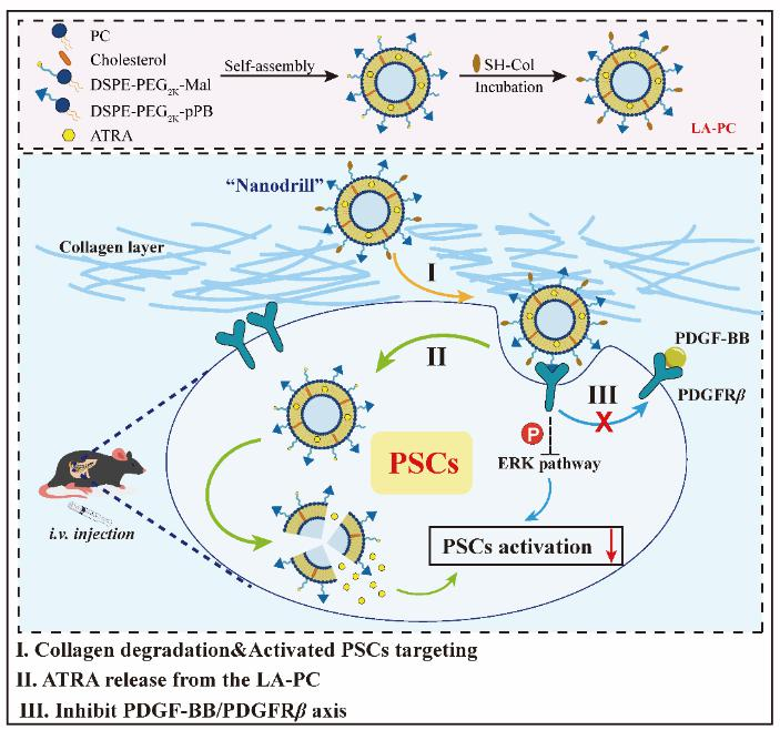 针对PSC分泌的ECM严重阻碍治疗药物向胰腺的深层递送,削弱药物对胰腺纤维化的治疗效果这一问题,该团队通过在脂质体表面负载胶原酶I和PSC靶向肽(pPB肽),设计了一种全新的PSC靶向调控平台(LA-PC),胶原酶I能够有效分解CP胰腺中致密的ECM层,实现LA-PC在胰腺组织深层中的分布。此外,LA-PC表面修饰的pPB肽与激活的PSC表面血小板衍生生长因子受体β(PDGFRβ)相结合,增加PSC对药物的有效摄取。这一有效结合还能够抑制血小板衍生生长因子B(PDGF-BB)对PDGFRβ的激活,进而抑制其下游MAPK通路,抑制PSC的活化,对胰腺纤维化具有良好的治疗作用,也为纤维化类疾病的靶向治疗提供了新的策略和思路。