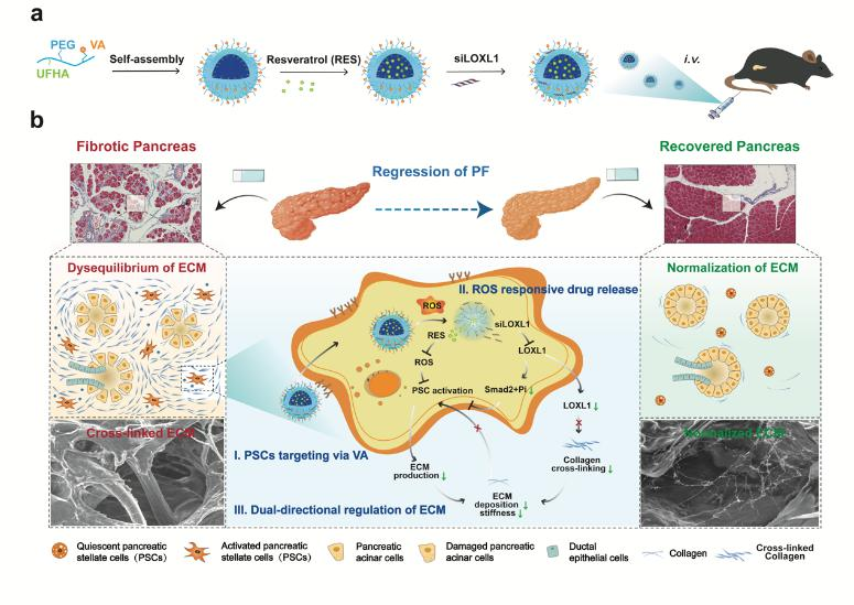 针对PSCs活化和赖氨酰氧化酶(LOX)介导细胞外基质(ECM)过度沉积这一病理特征,该团队首先确定赖氨酰氧化酶样蛋白1(LOXL1)为潜在的干预靶点,进一步构建PSC靶向调控制剂(LR-SSVA),通过 VA 靶向PSC,从而有效地将siLOXL1(沉默LOXL1基因的siRNA)和白藜芦醇(RES)递送至胰腺,清除积聚的活性氧(ROS),抑制PSC激活,同时抑制胶原交联,促进细胞外基质(ECM)降解,协同重塑基质与微环境稳态平衡。该研究设计的LR-SSVA制剂可以作为一种理想的PSC靶向调控系统,用于恢复ECM的平衡以逆转胰腺纤维化。
