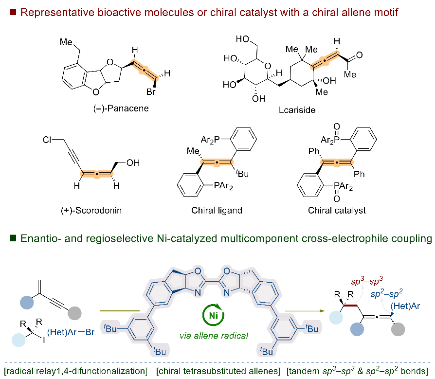 该团队开发了一种新型手性配体,成功实现了镍催化未活化烷基碘、1,3-烯炔和芳基溴之间的区域和立体选择性C(sp3)-C(sp3)及C(sp2)-C(sp2)的串联自由基交叉偶联反应。该方法反应条件温和、底物适用性广泛,为从简单原料高效合成手性四取代联烯化合物开辟了新的途径。