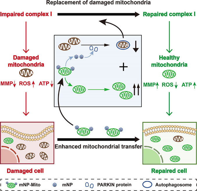 Leber遗传性视神经病变(Leber’s hereditary optic neuropathy, LHON)是线粒体呼吸链复合物I功能受损引发的眼部线粒体疾病,目前尚无有效的治疗方法。线粒体移植是一种通过将健康的线粒体提供给受损细胞,挽救细胞活力的疗法。然而细胞膜与线粒体膜间的静电斥力影响了线粒体移植的效率,且在体外提取线粒体过程中会不可避免的造成一定的线粒体损伤,这限制了线粒体移植疗法在临床中的应用。针对以上问题,姜虎林教授团队设计了负载PARKIN mRNA的纳米工程化线粒体(mNP-Mito),通过递送外源线粒体来替换功能障碍的线粒体,mNP的修饰不仅可以改变线粒体的表面电荷增强细胞对于线粒体的摄取,而且可以促进受损线粒体的线粒体自噬清除,增强线粒体移植效率。该疗法可以恢复线粒体呼吸链复合物I的功能,用于 LHON的治疗。