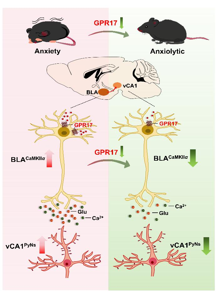 G蛋白偶联受体17(GPR17)在中枢神经系统表达水平较高。但GPR17在不同脑区和不同类型神经元中的分布和功能以及在精神疾病中的作用知之甚少。该团队发现,GPR17在慢性束缚应激诱导的焦虑模型小鼠基底外侧杏仁核(BLA)谷氨酸能神经元中的表达水平显著增加;敲减BLA谷氨酸能神经元中GPR17基因能显著改善小鼠焦虑样行为;过表达BLA谷氨酸能神经元中GPR17能显著增加小鼠对应激易感性。研究发现,GPR17通过调控BLA脑区谷氨酸能神经元兴奋性,影响BLA至腹侧海马CA1亚区谷氨酸能神经冲动传递,从而调节小鼠焦虑样行为,这一发现为确立GPR17作为抗焦虑药物作用靶点奠定了基础。