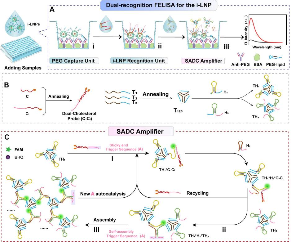 脂质纳米颗粒(LNPs)已被广泛用于小分子、核酸和疫苗递送。LNPs在体循环中完整聚乙二醇(PEG)化LNPs(i-LNPs)的含量是反映其体内长循环与药效的关键。该研究基于PEG/脂膜双重识别策略与新型催化发夹自组装的信号放大策略,建立了荧光酶联免疫吸附法(DR-FELISA)用于i-LNPs的专属捕获与微量检测,助力LNP药物的理性设计与成药性评价等研究。