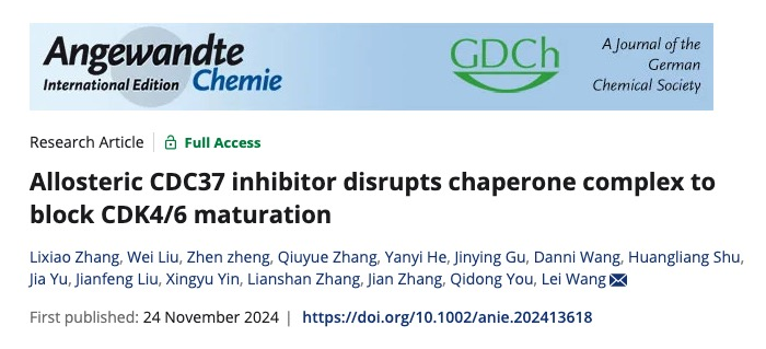 近日,王磊/尤启冬团队、上海交通大学医学院的张健教授、恒瑞医药全球研发总裁张连山教授作为共同通讯作者在在Angew. Chem发表题为“Allosteric CDC37 inhibitor disrupts chaperone complex to block CDK4/6 maturation”的研究论文。该研究发现了首个靶向CDC37的小分子化合物DDO-6079,其以变构作用机理同时实现了对HSP90-CDC37和CDC37-CDK4/6复杂蛋白互作的协同抑制。此外,研究还阐明了DDO-6079逆转Palbociclib耐药的机制,结果表明DDO-6079通过抑制CDK4/6的成熟和降低CDK6蛋白的热稳定性,进而恢复CDK4/6抑制剂在耐药细胞中的敏感性。yl6809永利检测中心2021级博士生张立晓、2020级博士生刘伟、上海交通大学医学院助理研究员郑振、yl6809永利检测中心副教授张秋月、2021级硕士生何彦仪为本文共同第一作者。