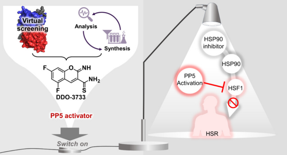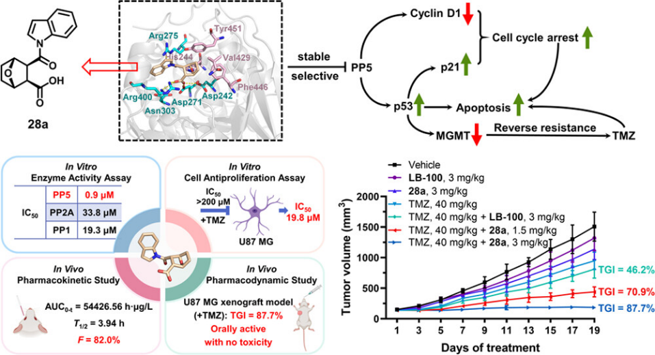 PP5是既是一种重要的共伴侣蛋白,也是重要的磷酸酶,通过去磷酸化底物蛋白,调控其活性、稳定性等重要特性。然而,目前对调控PP5的继发生物学效应研究尚不明确,致使靶向PP5药物应用受限。为此,该团队同时进行PP5抑制剂和激动剂开发:发现首个高选择性PP5抑制剂28a,诱导细胞周期阻滞和逆转TMZ耐药性;发现首个高活性PP5变构激动剂DDO-3711,揭示其在降低HSP90抑制剂的热休克蛋白毒性方面具有潜在价值。两项研究探索了PP5调控效应及应用,为PP5的研究和应用提供了新的工具和思路。