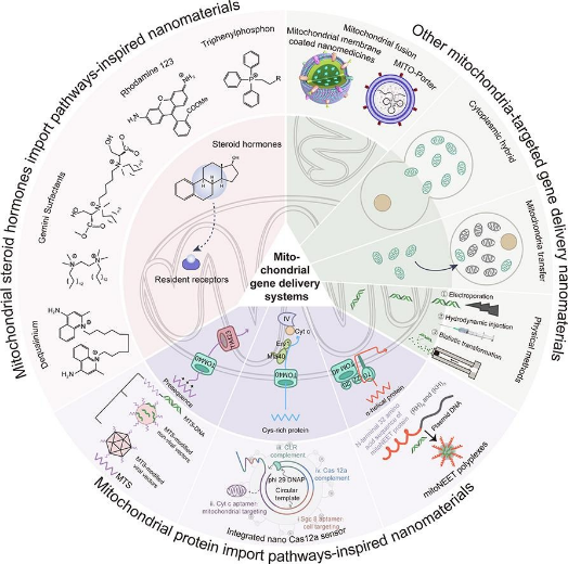 基于前期基础,该团队系统总结了受线粒体内源性物质运输途径启发的线粒体靶向基因递送系统,其中包括受线粒体类固醇激素导入途径启发的纳米材料、受蛋白质转运途径启发的纳米材料以及其他线粒体靶向基因递送纳米材料,并详细介绍了线粒体靶向递送系统的设计理念及其所面临的挑战。