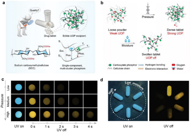 先进的过程分析技术(PAT)能够提高药品的生产效率和改善药品的质量。该团队通过对传统的药用高分子辅料从分子到颗粒的不同尺度的物质属性之间的构效关系展开系统地研究,揭示了羧甲基纤维素钠(SCC)的超长有机磷光(UOP)特性并开发了一种基于高灵敏度和信噪比的余辉成像的PAT技术。该技术成功对片剂硬度、湿度等关键质量属性进行原位、无损地检测,还便于患者利用肉眼判断药品在储存过程中的品质。该工作不仅加深了对辅料的结构与性质、功能的新认识,而且还展示了先进的可视化技术在药品质量控制和改善患者安全用药方面的潜在应用,为智能制造技术在药品及食品等领域的应用发展提供了新的思路。