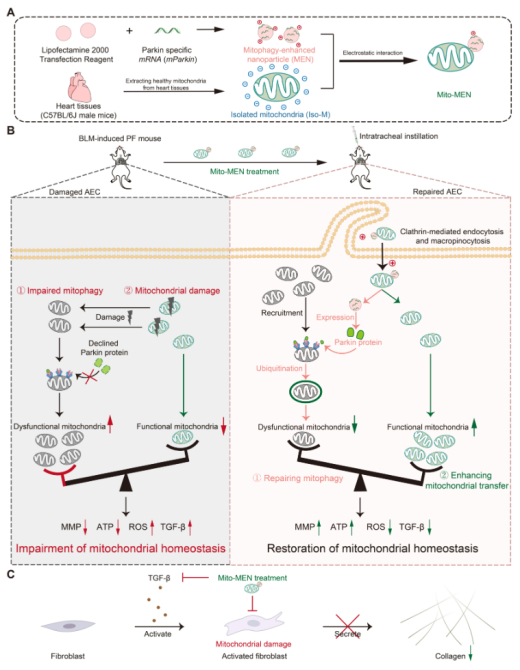 肺纤维化(Pulmonary fibrosis,PF)是一种进行性且致命的间质性肺部疾病,与肺泡上皮细胞线粒体稳态失衡密切相关,该疾病也是典型的继发性线粒体疾病。线粒体移植可通过递送外源性线粒体恢复线粒体功能。然而在PF病理状态下,由于线粒体自噬受损,功能障碍的线粒体无法得到有效清除,这影响了线粒体稳态调控的效果。该研究团队构建了一种线粒体自噬增强型纳米粒修饰的工程化线粒体,一方面通过提高线粒体递送效率增加细胞内健康线粒体的比例;另一方面通过促进功能失调线粒体自噬降解降低受损线粒体的比例,共同调节线粒体稳态。在博来霉素诱导的PF小鼠模型中,工程化线粒体有效修复线粒体功能,并缓解PF症状。