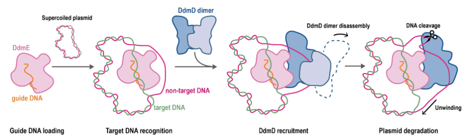 细菌免疫系统DdmDE通过消除侵入性质粒为细菌带来适应性优势。该研究通过生化分析和结构解析揭示了乳杆菌来源DdmDE系统(LcDdmDE)的酶学功能、组装和激活机制,明确了DdmDE通过特异性识别外源DNA激活其核酸切割活性,从而阻断外源核酸的扩散。该研究为细菌如何抵御质粒入侵、限制基因水平转移提供了新的见解,为控制耐药基因传播提供新思路。DdmE在向导DNA的引导下特异性靶向互补DNA的特性以及DdmD的双链解旋和质粒切割活性使DdmDE系统用于基因编辑成为可能。