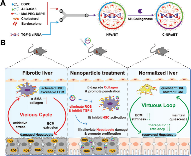 针对纤维化肝脏内“活化的肝星状细胞-受损的肝实质细胞”相互作用构成恶性循环的病理特点,该团队构建恶性循环逆转型药物递送系统,抑制TGF-β信号通路和抗氧化应激,从而抑制肝星状细胞活化并修复受损肝实质细胞,有效调控肝纤维化病理微环境。该研究提出了一个创新的策略,调节细胞相互作用,以增强抗纤维化治疗,并提出治疗其他慢性肝病的一种可行的策略。