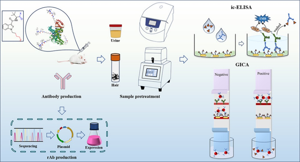 合成大麻素类物质是新精神活性物质中涵盖种类最多、滥用最为严重的家族,众多非法药物使用案件中鉴定出一类吲唑和吲哚母核的新型酰胺类合成大麻素,但目前缺乏对这类大麻素广谱的免疫分析方法。该团队基于滥用的新型吲唑和吲哚酰胺类合成大麻素制备相应高亲和力单克隆抗体,并建立酶联免疫吸附法(ELISA)和胶体金免疫层析法(GICA)用于生物样本中合成大麻素的广谱定性定量检测,助力现场快检。该研究还报道了合成大麻素类抗体的特异性氨基酸序列并阐述作用模式,为未来不断迭代更新的合成大麻素类物质的单克隆抗体开发提供重要工具。