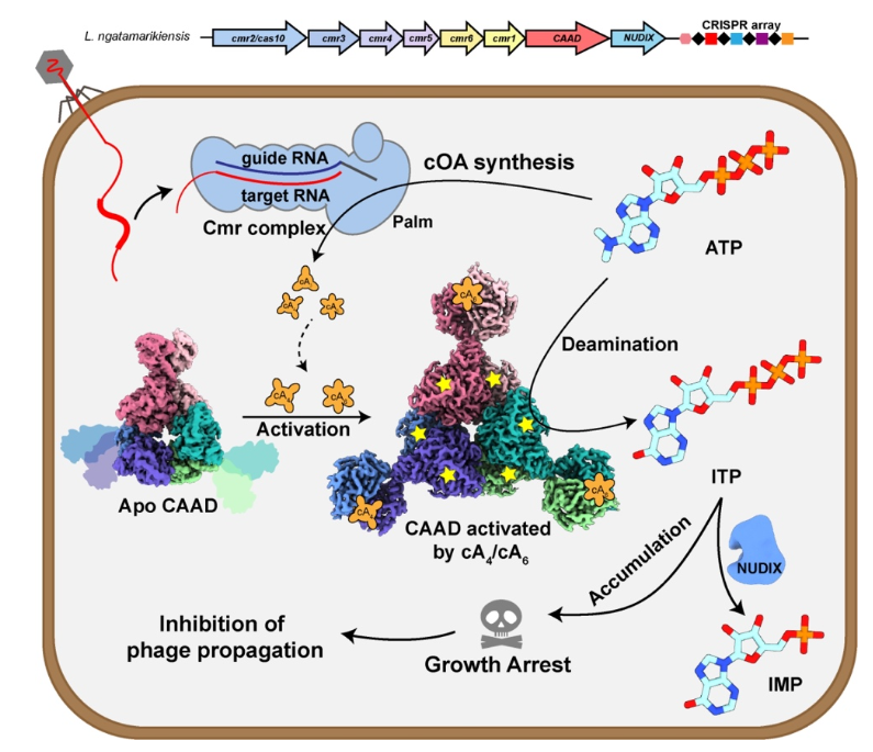CRISPR-Cas系统是原核生物中广泛存在的一种由RNA引导靶向外源遗传物质的免疫系统。该团队通过多学科交叉研究发现了一种新型的CRISPR-CAAD免疫系统。在感染噬菌体等入侵核酸后,CRISPR-Cas利用ATP为底物合成cA4/cA6环化寡聚腺苷酸作为信使分子,激活偶联的CAAD脱氨酶,通过脱氨反应将ATP转化成ITP,从而抑制被感染细菌的生长以阻止噬菌体扩散。同时进一步证明了水解酶Nudix可特异性地将ITP降解成无毒的IMP, 使细菌在解除感染后能够恢复生长。团队利用冷冻电镜捕捉到了CAAD激活过程中一系列高分辨率三维结构,直接观察到并证实了其激活过程中存在协同效应。该项研究发现了细菌免疫系统中一条全新的核苷代谢-免疫调控-抗病毒通路,并阐明了其具体的分子机制,为开发III型CRISPR系统作为应用工具打下重要的理论基础。