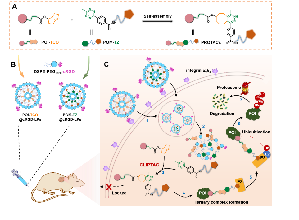 研究团队开发了一种全新体内自组装的PROTAC技术(Nano-CLIPTACs),通过生物正交化学中的IEDDA反应,将小分子前体精准递送至肿瘤组织并原位组装为活性PROTAC,实现了高效的肿瘤特异性靶向蛋白降解。