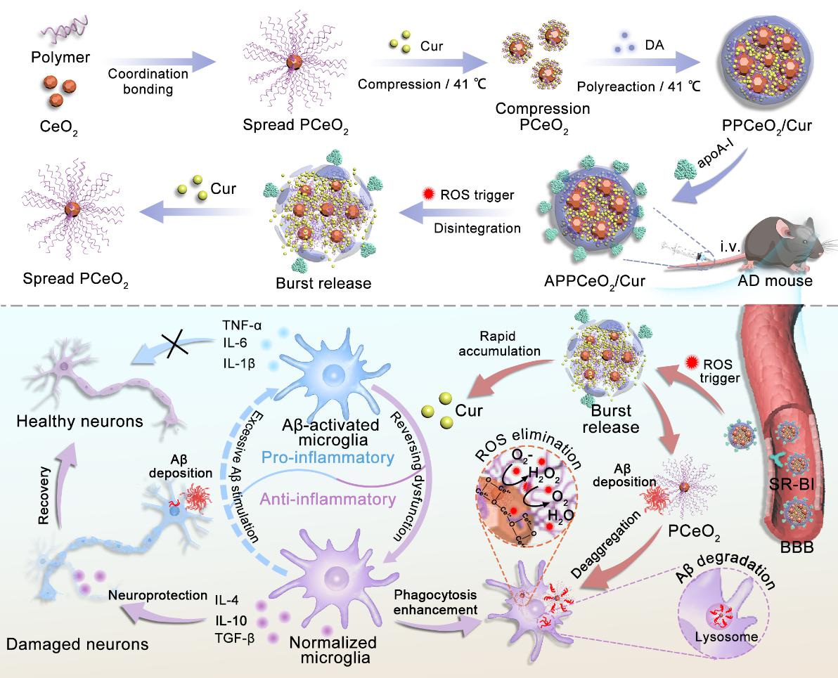 利用浓集给药策略调控小胶质细胞功能障碍对阿尔茨海默病(AD)治疗收益显著,但血脑屏障是脑内药物递送的最大障碍。针对上述科学问题,本研究提出了一种仿生弹性压缩给药系统,通过响应脑内活性氧(ROS)实现难溶性药物的病灶高效浓集递释。设计并合成温敏形变聚合物为基材,温控高量压缩负载姜黄素(Cur)并配位接枝超小氧化铈纳米粒(CeO₂),随后联合多巴胺自聚、载脂蛋白修饰,增强给药系统稳定性和脑内递释活性。给药系统达病灶后,逆转小胶质细胞功能障碍促进Aβ内吞降解,发挥神经元保护功能并消除ROS,为AD治疗提供了新思路和新方案。