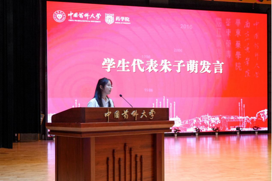 2025级药理专业硕士研究生朱子萌作为新生代表发言,她号召同学们秉承“精业济群”的校训精神与“尚德修身,鼎新弘药”的院训精神,将道德修养融入科研实践,将创新精神注入专业研究,真正成长为德才兼备的药学人。