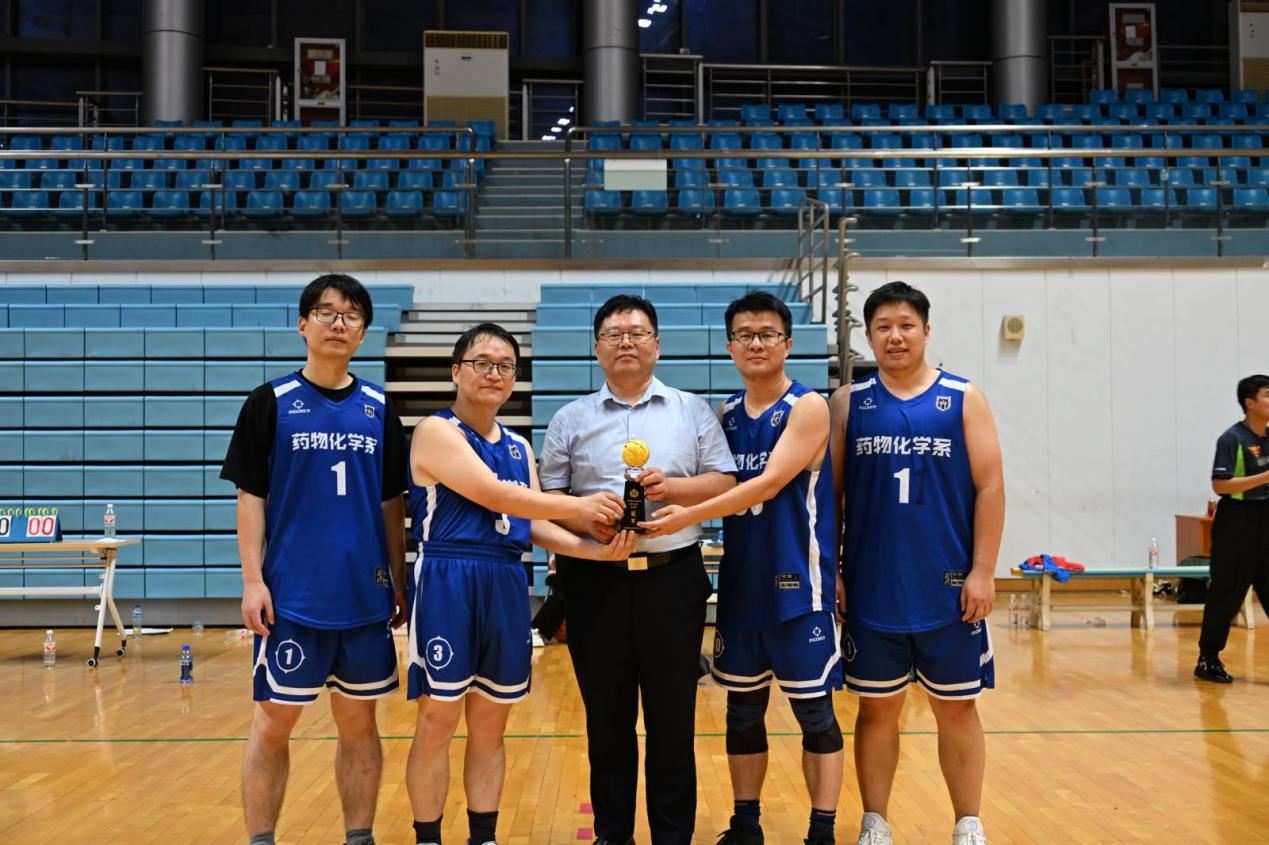 三尺讲台上,他们诲人不倦,精益求精。比赛场上,他们凝心聚力,团结拼搏。各代表队球员们精神抖擞,激情满怀,他们奔跑、跳跃、传球、投篮,每一个动作都充满力量与技巧,他们用精彩的比赛赢得了大家的掌声。在激烈的角逐中,药物化学系代表队以辉煌战绩勇夺冠军,药公司党委书记范素文为获胜队颁发了冠军奖杯。
