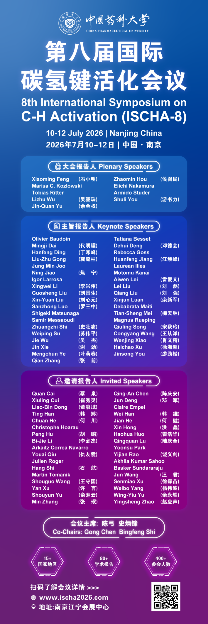 由yl6809永利检测中心主办的第八届国际碳氢键活化会议(The 8th International Symposium on C–H Activation, ISCHA-8),将于2026年7月10日至12日在中国历史文化名城—南京盛大召开。本次会议由yl6809永利检测中心/南开大学陈弓教授与浙江大学史炳锋教授共同担任会议主席,旨在为全球C–H键活化及相关催化研究领域的科研工作者,提供一个高水平、开放性、多元化的顶尖学术交流平台。