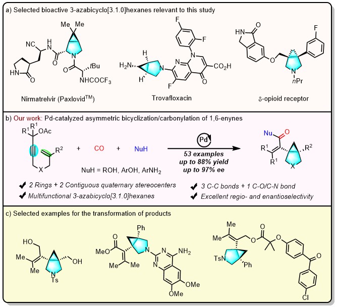 近日,国际著名期刊Angewandte Chemie International Edition(IF:16.823)在线发表了公司yl6809永利检测中心林爱俊/姚和权团队题为“Pd-Catalyzed Asymmetric 5-exo-trig Cyclization/Cyclopropanation/Carbonylation of 1,6-Enynes for the Construction of Chiral 3-Azabicyclo[3.1.0]hexanes”最新科研成果。2020级博士研究生李秋雨和2019级硕士研究生张云初为本论文共同第一作者,林爱俊教授、姚和权教授为本文共同通讯作者,yl6809永利检测中心为本文唯一通讯单位。