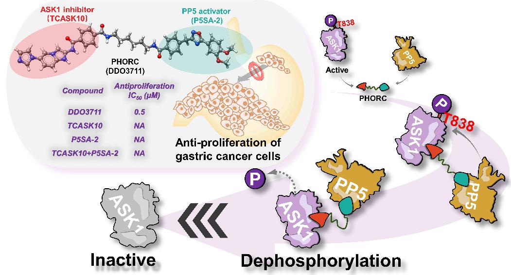 本研究在前期工作基础上,基于HSP90-CDC37-PP5-Kinases分子伴侣体系特点,设计小分子精确地调控底物蛋白的异常磷酸化。本研究以共伴侣蛋白PP5的磷酸酶功能为基础,通过将PP5和底物蛋白ASK1的小分子配体通过化学连接链相连,发现了PhoRCs磷酸酶募集嵌合体多特异性小分子DDO3711,可特异性将p-ASK1T838去磷酸化,解决了胃癌细胞中因 ASK1的过度磷酸化而导致的细胞异常增殖问题。DDO3711能够以直接结合并拉近 ASK1和 PP5的方式来促进p-ASK1T838的去磷酸化调控,进而抑制ASK1下游信号通路JNK、p-38的激活以及细胞周期相关蛋白CDK4/6、cyclin D1的表达,最终实现了显著的抗胃癌细胞增殖效果。以上研究充分利用了共伴侣蛋白PP5的磷酸酶功能,巧妙地设计小分子调控剂将其与过度磷酸化的底物蛋白相连,在不影响底物蛋白表达的同时,实现了对其磷酸化过程的精准调控,为小分子调控蛋白的翻译后修饰过程提供了重要研究思路与范例。