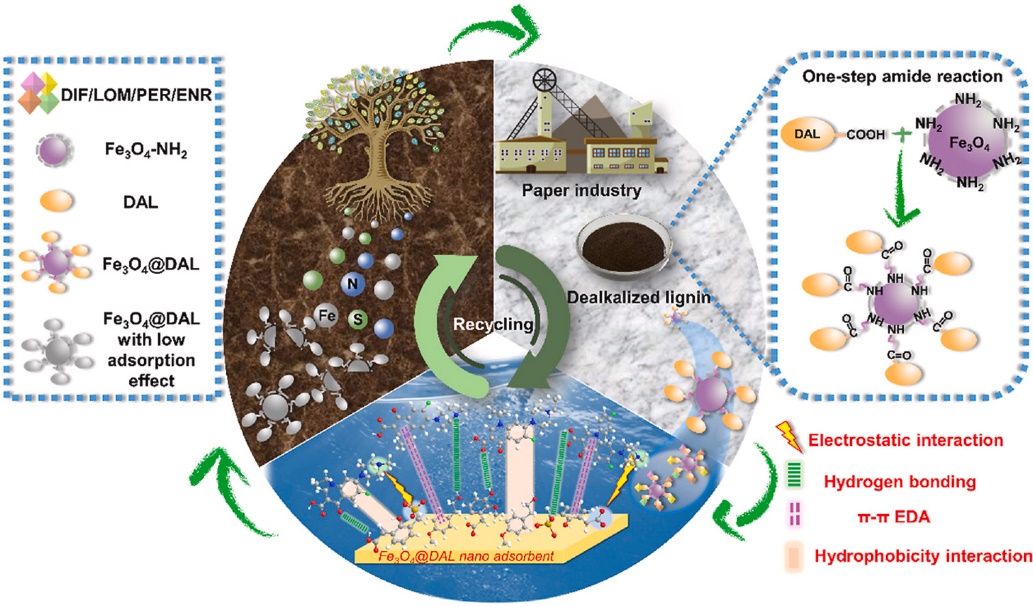 抗生素在畜牧业和农业中的使用导致水体中抗生素的过度排放,长期可能导致耐药并对生态产生影响。研究团队开发了一种绿色环保型吸附材料:脱碱木质素接枝磁性纳米粒(Fe3O4@DAL),用于环境水体中氟喹诺酮类抗生素的去除。Fe3O4@DAL将磁性纳米粒子的高效分离性能与可再生木质素活性官能团丰富的结构特点相结合,具有催化过硫酸盐对氟喹诺酮类抗生素进行氧化降解的能力。回收后的吸附剂仍可作为肥料缓释剂二次利用。相关工作以“Designing Degradable Lignin-grafted Magnetic Nano-composite Materials for Cost-effectively Sustainable Removal of Fluoroquinolone Antibiotics from Environmental Water”为题发表于Journal of Cleaner Production。公司2020级硕士研究生侯思妤为本文第一作者,纪顺利副教授为本文的通讯作者,yl6809永利检测中心为本文的第一通讯单位。
