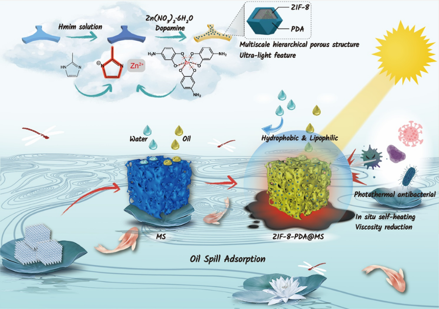 工业生产和日常生活中有毒试剂和含油废水的非法排放,以及频发的海上石油泄漏事故严重破环了生态环境。受“贻贝黏附”和“莲叶效应”的启发,研究团队利用聚多巴胺的生物黏附性和还原性,通过配体交换作用将具有大比表面积和高孔隙率的MOF材料(Ag NPs负载)修饰在三聚氰胺海绵(MS)的三维多孔骨架上,制备了一种具有超疏水/超亲油特性的功能复合材料--ZIF-8-PDA-Ag@MS。其具有微/纳米粗糙表面和多尺度分层多孔结构,及良好的阻燃性,能实现水中溢油和有机试剂的选择性高效吸附。此外,还具有光热联合抗菌和光热降粘协同作用,解决了高粘度原油因流动性差所导致的溢油回收难题。相关工作以“A Green and Facile One-Step Hydration Method Based on ZIF-8-PDA to PrepareMelamine Composite Sponges with Excellent Hydrophobicity for Oil-Water Separation”为题发表于Journal of Hazardous Materials上。公司2020级硕士研究生张钰琪为本文第一作者,柳文媛教授、纪顺利副教授为本文共同通讯作者,yl6809永利检测中心为本文第一通讯单位。