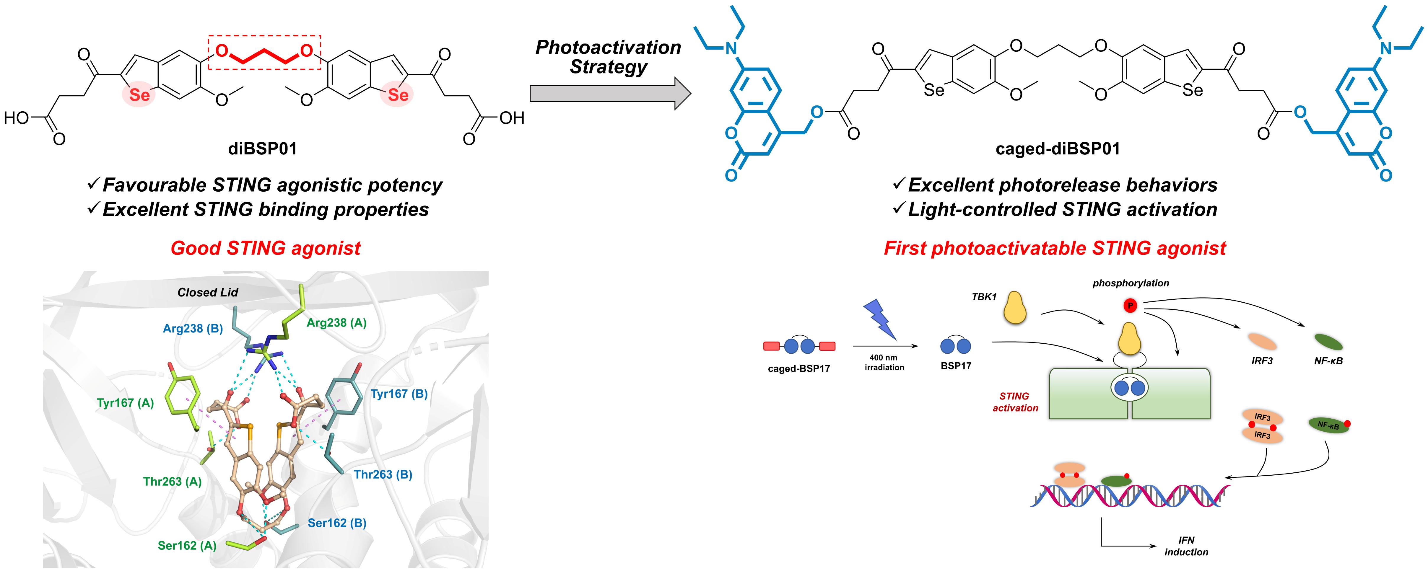 进一步,该团队通过结构指导的合理药物设计发现了一类具有良好靶标活性和细胞活性的二聚化STING激动剂。然而,由于STING蛋白在体内多种组织细胞中的广泛表达,该二聚分子与其他通过全身给药的STING激动剂一样,容易引起全身的免疫炎症反应,导致药物治疗窗狭窄。为了解决这一问题,该团队创新性地引入光响应型前药的概念,在该二聚分子的结构基础上成功构建出可以通过紫外可见光激活的STING激动剂前药。该前药在细胞水平及斑马鱼异种移植瘤模型中均表现出显著的光依赖性抗肿瘤活性。综上,本研究验证了小分子光控STING激动剂设计策略的可行性,为STING相关疾病的精准治疗提供了新的思路。相关研究以“Discovery of a Photoactivatable Dimerized STING Agonist Based on the Benzo[b]selenophene Scaffold”为题发表在Chemical Science上。公司硕士研究生刘东宇、博士研究生喻彬以及广西科学院的管鑫为本文的共同第一作者,李志裕教授和卞金磊副教授为本文的共同通讯作者,yl6809永利检测中心为本文第一通讯单位。