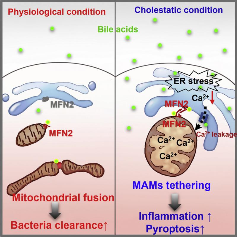郝海平教授、曹丽娟副研究员团队发现GTPase样的动力酶MFN2是内源性胆汁酸的直接受体,在胆汁淤积病理情况下高浓度胆汁酸可激活MFN2促进线粒体-内质网束缚融合,导致内质网内钙离子转移入线粒体进而激活NLRP3炎症小体并诱导巨噬细胞细胞焦亡,解释了细菌感染性休克病理情况下,胆淤作为危险并发症触发过度免疫反应导致炎症因子风暴和器官衰竭的病理机制。相反,生理水平的胆汁酸则通过MFN2促进线粒体之间的融合反应,延长巨噬细胞寿命并促进细胞吞噬作用进而有助于清除细菌。综上,该研究揭示了胆汁酸-MFN2信号轴在协调病原体入侵后的固有免疫反应中发挥双向调节的作用。