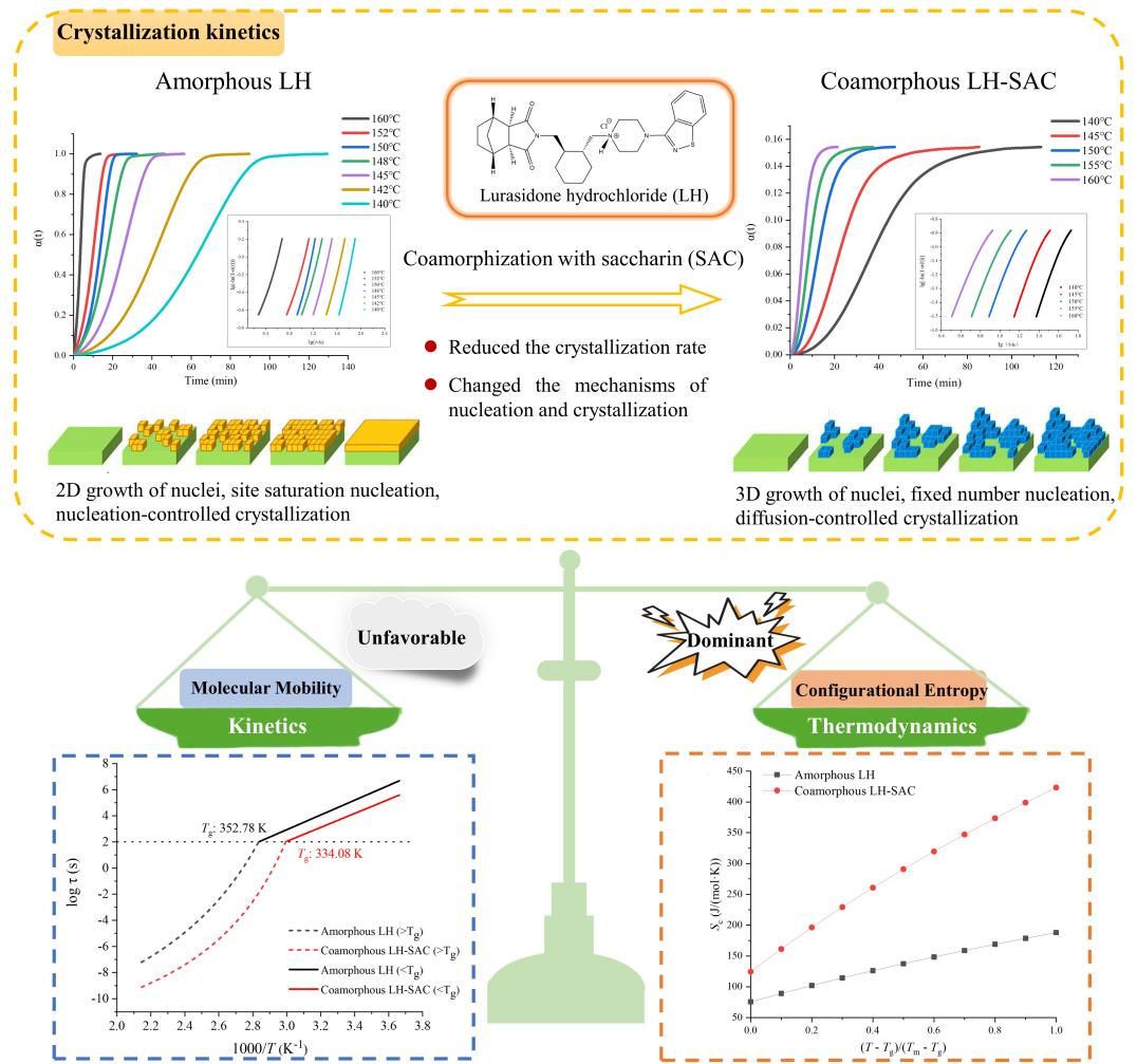 张建军团队以精神疾病治疗药物盐酸鲁拉西酮为模型,系统研究了其与糖精所形成共无定形的结晶机制,并从热力学和动力学两个角度综合阐明了共无定形体系在分子水平上改善稳定性的机制。研究结果表明,与单独药物无定形相比,共无定形体系在玻璃态和过冷液态的结晶速率显著降低;且成核机制由位置饱和成核转变为固定数量成核,晶体生长由2D向3D成核生长发生转变,结晶机制由成核控制转变为扩散控制;并创新性地提出了热力学因素(构型熵)而非动力学因素(分子运动性)对共无定形稳定性改善的重要贡献,同时结合分子动力学模拟手段从分子水平揭示了共无定形的结晶机理。本研究有助于深入理解药物共无定形的结晶行为及稳定性机制,为共无定形处方的合理设计及其产品开发奠定了理论基础。
