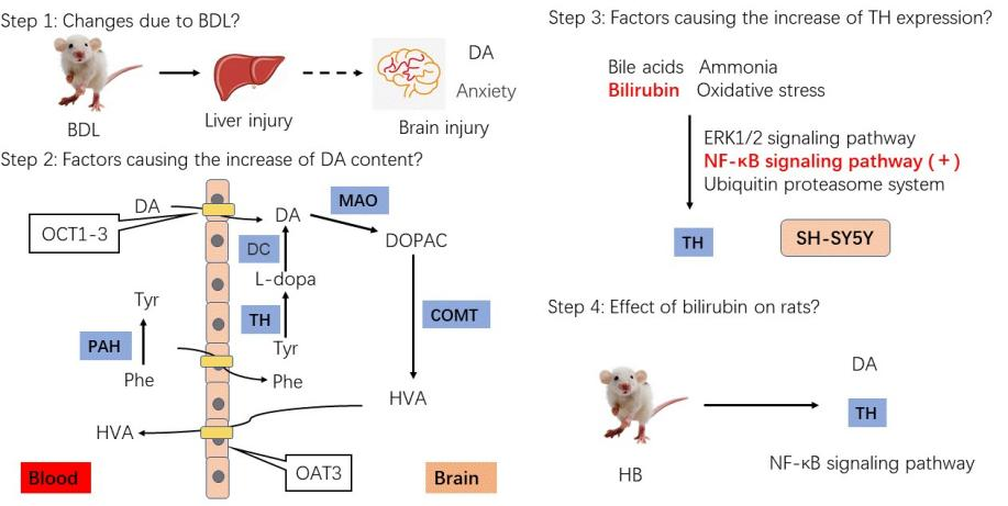 肝性脑病是肝衰竭的严重并发症,大脑中多巴胺水平升高是其典型症状之一。团队利用胆管结扎(BDL)大鼠研究多巴胺水平增加和精神异常之间的关系,并研究了肝衰竭增加脑内多巴胺水平的可能机制。研究结果发现BDL大鼠表现出类似焦虑的行为,同时多巴胺水平和皮层酪氨酸羟化酶蛋白表达增加。进一步的研究发现胆红素水平升高是诱导酪氨酸羟化酶表达的重要因素,NF-κB通路参与胆红素水平诱导酪氨酸羟化酶表达的作用,在高胆红素血症大鼠中也表现出与BDL大鼠中相同的焦虑样行为、多巴胺水平和酪氨酸羟化酶蛋白表达显著增加。综上所述,BDL显著增加大鼠皮层多巴胺水平,胆红素通过NF-κB通路诱导酪氨酸羟化酶功能和表达增加是BDL状态下脑内多巴胺水平升高的主要原因之一。