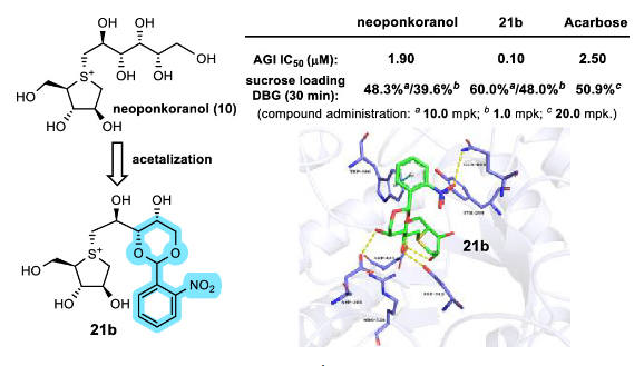 从五层龙属植物根部提取的锍鎓盐类活性天然产物具有新颖独特的化学结构,研究表明其对α-葡萄糖苷酶抑制活性功效与同类上市药物阿卡波糖、伏格列波糖相当,包含这些天然活性分子的五层龙提取物已经被开发成用于降糖、减肥的健康食品在日本上市。与之相关的全合成以及结构修饰一直是药物化学和有机合成化学领域的研究热点。课题组近年来围绕该领域进行较为深入地研究,开发了高效的合成方法(Angew. Chem. Int. Ed. 2019)。在此基础之上,为了突破国外化合物专利,课题组保留了天然产物中结构保守性区域,运用骨架跃迁策略通过在其侧链片段引入环状的苯甲缩醛结构,设计合成了一系列新型的锍鎓盐类α-葡萄糖苷酶小分子抑制剂。大部分小分子抑制剂体外酶抑制活性比同类口服降糖药物高出数十倍。在小鼠体内的降糖实验中,化合物21b表现出超强的降糖能力,同为20mg/kg的治疗组中,21b表现出远高于阿卡波糖的降糖活性,当把给药剂量降低到到1mg/kg时,21b的降糖能力仍然与阿卡波糖(20mg/kg)对照组相当。初步的毒理实验也表明21b具有良好的安全性。21b也成为迄今为止发现的降糖活性最强的锍鎓盐类α-葡萄糖苷酶抑制小分子。此项工作为该类多手性中心、结构保守性非常高的天然产物的结构修饰和新药开发提供了重要的研究思路。