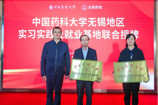 实习实践和就业基地联合挂牌仪式上,教务处副处长江程、招生与就业处处长刘燕莉及药公司党委副书记、副经理吴春勇依次为老员工校外实习实践基地单位、校级就业基地单位和院级就业基地单位进行授牌。
