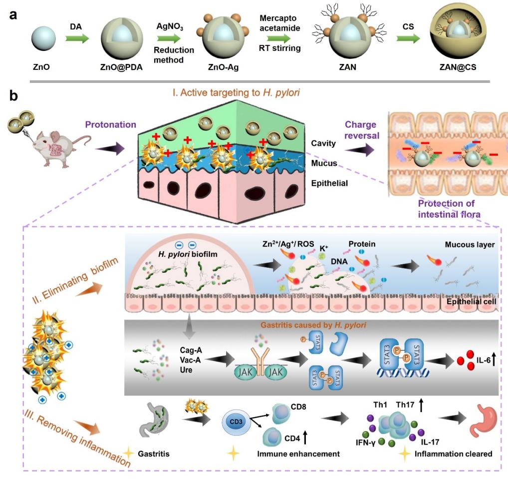 针对以上问题,研究团队研制了一种可质子化的金属基纳米药物ZnO-Ag-mercaptoacetamide@chitosan(ZAN@CS MNDs)。研究发现,该纳米药物经巯基乙酰胺修饰获得电荷转换能力,在胃内酸性条件下质子化带正电荷,主动靶向带负电的幽门螺杆菌,破坏细菌细胞膜,瓦解生物膜结构,最终彻底清除细菌。体内实验证明,ZAN@CS经壳聚糖修饰后可穿透胃粘膜屏障,延长胃内滞留时间。使用该纳米药物治疗后,模型小鼠幽门螺杆菌胃部定植量显著降低,毒力因子CagA、VacA和尿素酶的表达水平明显下降。此外,ZAN@CS可调节免疫反应并减轻胃内炎症,治疗期间胃内CD4+ T细胞含量明显增加,促炎因子IL-6、IL-10和IFN-γ表达水平降低。同时,ZAN@CS在肠道不发生质子化作用,带自身负电荷,对小鼠肠道细菌菌种组成、功能相对丰度、菌种相对丰度均无影响,且在28小时后可完全被机体代谢清除。该研究为幽门螺杆菌治疗拓展了新的思路和方法。