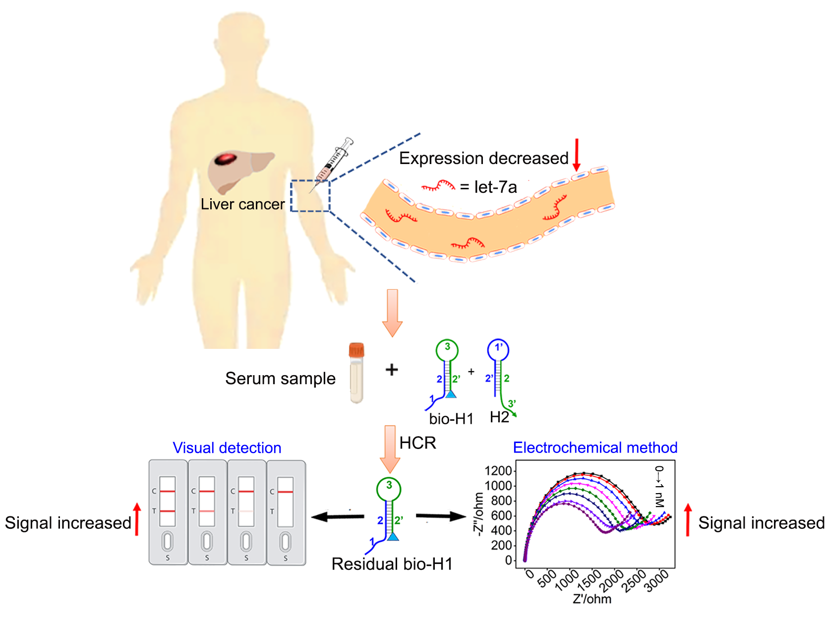 Let-7a是一种在肿瘤细胞中低表达的miRNAs,被认为是一种潜在的肿瘤抑制生物标志物和治疗靶点。因此,建立简便且灵敏的let-7a检测方法对肿瘤的诊断和治疗具有重要意义。在本工作中,let-7a通过两个发夹引物(H1和H2)启动杂交链式反应(Hybridization chain reaction,HCR)。之后,通过侧向流动分析(Lateral flow assay,LFA)和电化学阻抗法(Electrochemical impedance spectroscopy,EIS)进一步检测剩余引物H1。在LFA方法中,生物素修饰的H1(bio-H1)和游离H2用于引发HCR。随着let-7a浓度的降低,T线颜色逐渐增加,实现对let-7a的可视化检测;在电化学方法中,采用H1’-AuNP修饰电极检测bio-H1在不同浓度let-7a参与下的阻抗差值(ΔRct)。该方法可在10 fM和1.0 nM范围内检测let-7a,检出限为4.2 fM。所构建的两种检测方法被成功地应用于血清let-7a的分析,展示了其在血清样品分析中的潜在应用价值。该研究提出使用剩余引物法对miRNAs的间接检测,为miRNAs的检测提供了一种新的思路。