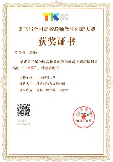 8月18日至22日,由教育部高等教育司指导、中国高等教育学会主办的第三届全国高校教师教学创新大赛全国现场赛在浙江大学举办。yl6809永利检测中心吴春勇、舒畅、廖文婷、苏梦翔《体内药物与毒物分析》课程团队参加角逐,荣获部属高校新医科正高组二等奖。
