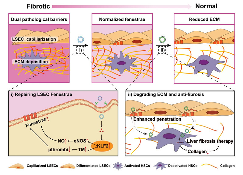 During liver fibrosis, the fenestrae in the liver sinusoidal endothelial cells (LSECs) would gradually vanish, hindering the exchange of substance and nano-carriers between blood and liver cells. Furthermore, the excessive ECM is likely to block the delivery of the nano-carriers to activated hepatic stellate cells (HSCs) as well. Herein, an efficient nano-drug delivery system was constructed to sequentially break through the capillarized LSEC barrier and the deposited ECM barrier. HA-NPs/SMV were designed to recover the loss of the fenestrae and CV-NPs/siCol1α1 were designed to decompose the deposited collagen and inhibit HSC activation. The study was published in ACS Nano entitled Sequential Nano-Penetrators of Capillarized Liver Sinusoids and Extracellular Matrix Barriers for Liver Fibrosis Therapy. Master's degree candidate Ling-Feng Zhang and Xing-Huan Wang and Master's degree holder Cheng-Lu Zhang are the co-first authors of this paper. China Pharmaceutical University is the first corresponding address.