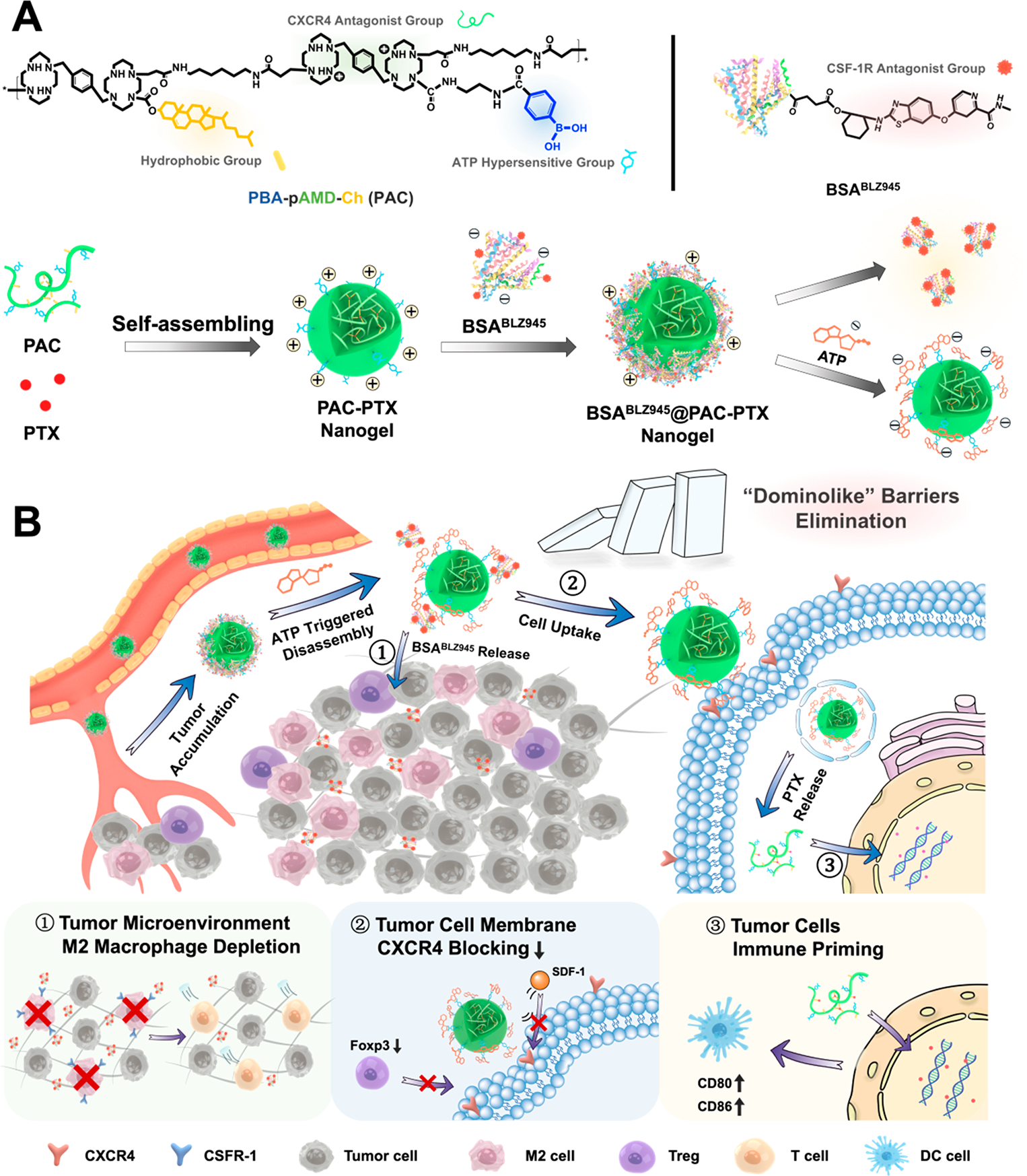肿瘤免疫治疗临床应用前景巨大。然而,肿瘤免疫抑制微环境(TIME)组分复杂,严重限制了免疫治疗的效果。基于其中TIME的复杂性,受多米诺效应启发,本研究创新提出:构建ATP超敏感纳米凝胶递药系统,用于肿瘤相关巨噬细胞(TAMs)形成的致密肿瘤基质的破除,及肿瘤免疫原性的深度激发。此项研究中,内、外部“分子桥接”可实现蛋白药物与化疗药物联合的包载与序贯逐级释放。体内外研究表明,ATP超敏感的纳米递药系统可通过多米诺式序贯递送方式深入肿瘤深部,减少约44%的TAMs分布,显著提升肿瘤免疫治疗响应率。本研究设计的多米诺式序贯递药平台具有组装工艺简单、智能时空响应等优势,为开发肿瘤免疫治疗递药平台提供了新思路与新方法。