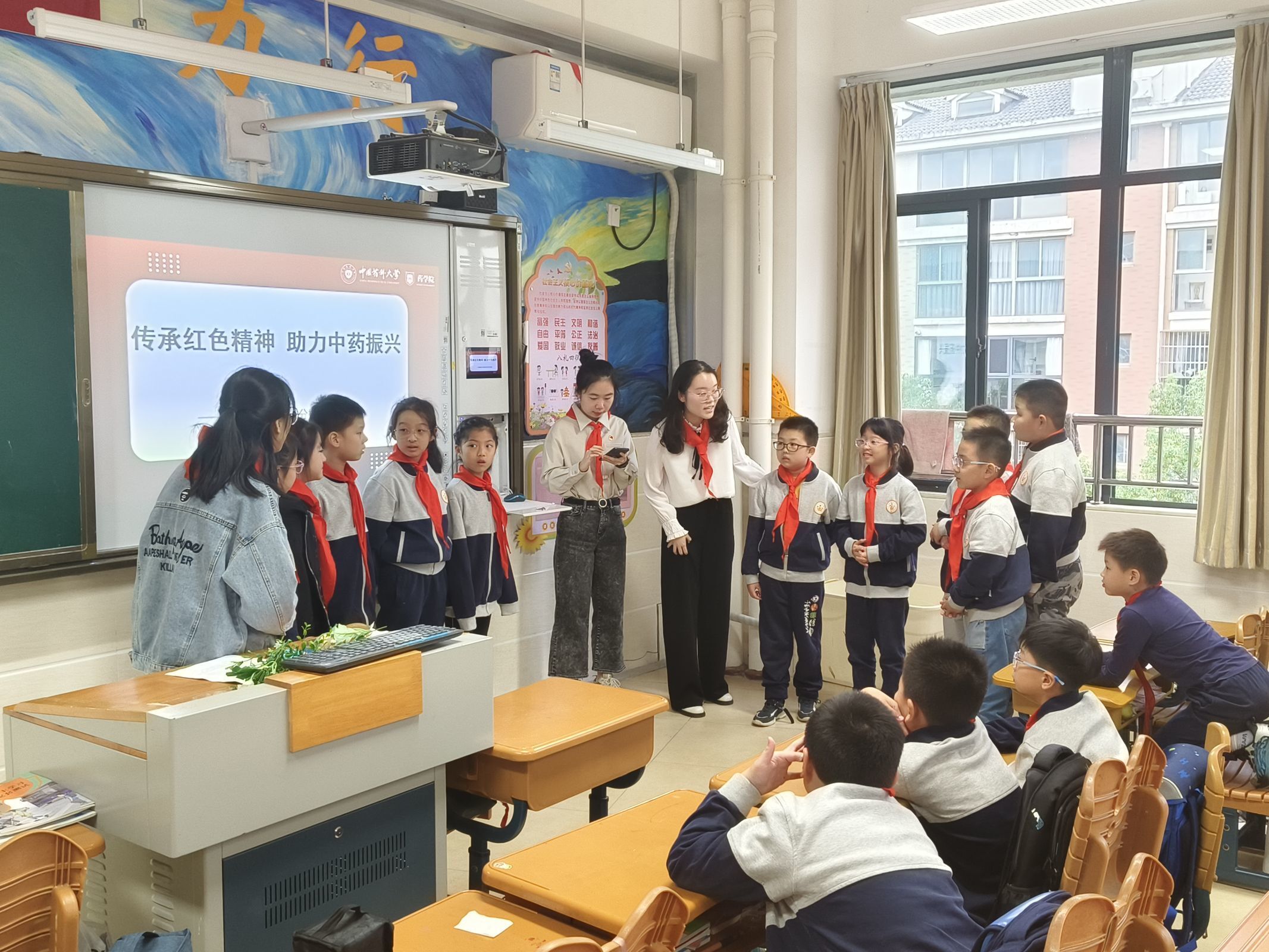 支部党员们主要从中医药文化传承的重要性、中医药历史文化渊源、中医药实用价值及其面临的困境以及看图识中药四个方面,与两所学校6个班级共计300余名小朋友进行互动宣讲。过程中,支部党员们通过讲述神农尝百草、李时珍撰写《本草纲目》、华佗创立“五禽戏”以及扁鹊开创“望闻问切”四诊法等中医名家故事引入中医药文化历史主题,并通过列举儿童病症中的常用中成药以及中医保健理念讲述了中医药在日常生活中的应用和普及,在最后的“看图识中药”的环节,现场的同学们积极踊跃参与互动,现场气氛热烈。