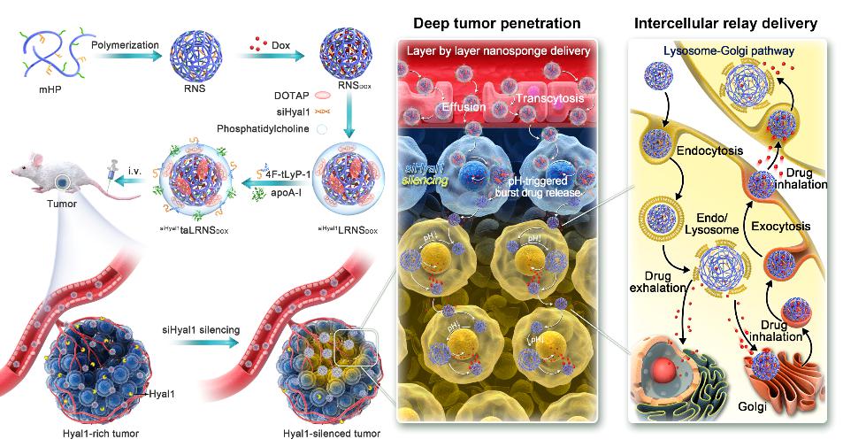 抗肿瘤纳米药物疗效高度取决于肿瘤部位的药物递送量,亦与瘤内药物渗透深度和滞留时间密切相关。因此,设计通过沉默肿瘤微环境降解酶的策略,延长药物瘤内渗透性和滞留性,以提升化疗药物瘤内生物利用度。该项研究报道了一种脂蛋白仿生的酶沉默型纳米海绵,该纳米海绵具有主动的细胞间层层渗透活性,瘤内渗透过程中能够可逆地释放(“呼”)/回收(“吸”)阿霉素 (DOX)。此外,纳米药物联载酶沉默小干扰RNA(siHyal1),降低以载体为底物的酶表达水平,延长纳米海绵的瘤内滞留和递药寿命,保持载体和药物肿瘤细胞层层传递过程中的时空一致性。这种创新性的肿瘤细胞间接力药物递送纳米海绵,展现了智能化的药物递送系统设计概念,显著提升了化疗药物的瘤内生物利用度和疗效。
